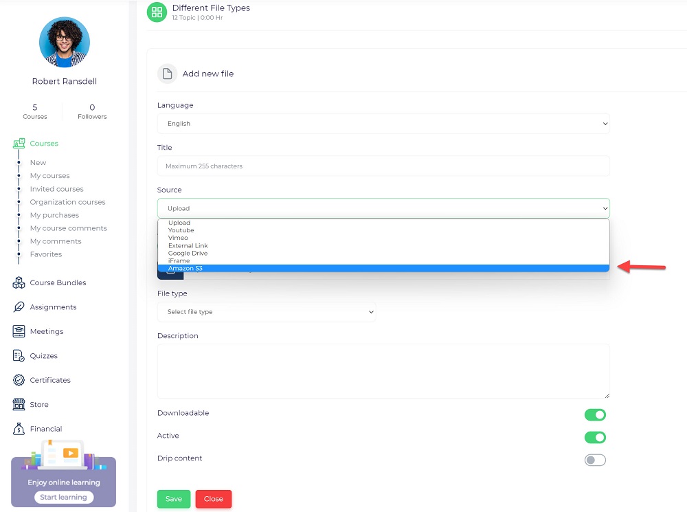When you define a course part, you need to select the S3 as the upload source.