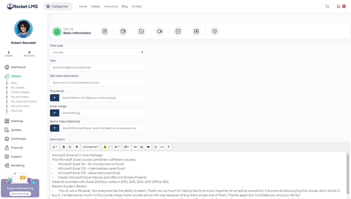 Description: The class description that will be displayed on the class page includes all of the information about the course educational material, instructor, and other related information that will motivate viewers to enroll in the course. We suggest writing at least 300 words for this page because it is one of the most important SEO requirements.
