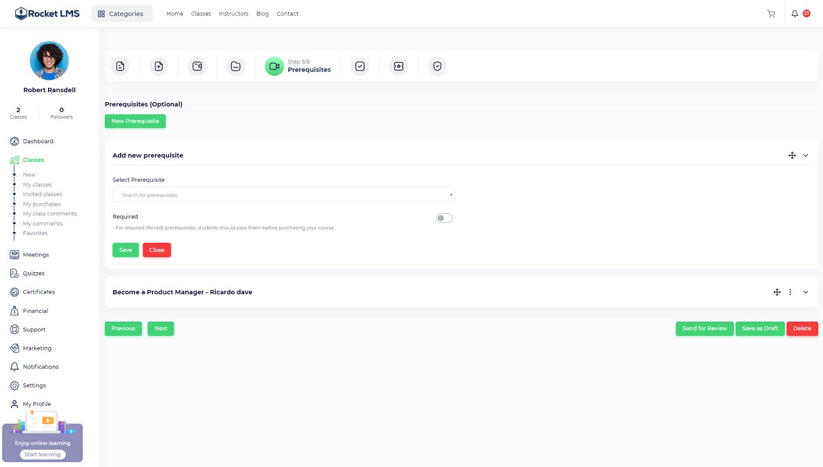 Partner instructor: If you want to invite another instructor to your course, you should turn this toggle on so the partner instructor dropdown will be displayed and you will be to add single or multiple instructors to the course. The invited instructor profile will be displayed on the course page and the invited instructor will be able to view the course through the “Instructor panel/ Classes/ Invited classes”.