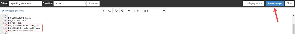 Go to the cPanel file manager and navigate to the public_html folder. Edit the “.env” file and put the database information according to the following screenshot and save changes.