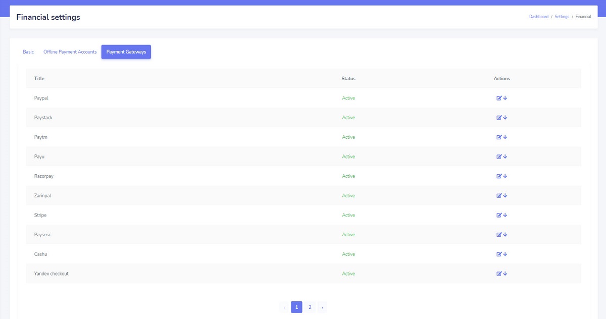 - Activate your favorite payment gateways from the admin panel: In this step, you will specify which payment gateways will be displayed on the platform frontend during different payment processes. Go to "Admin Panel/ Settings/ Financial/ 'Payment Gateways' tab" and enable/disable each payment gateway.