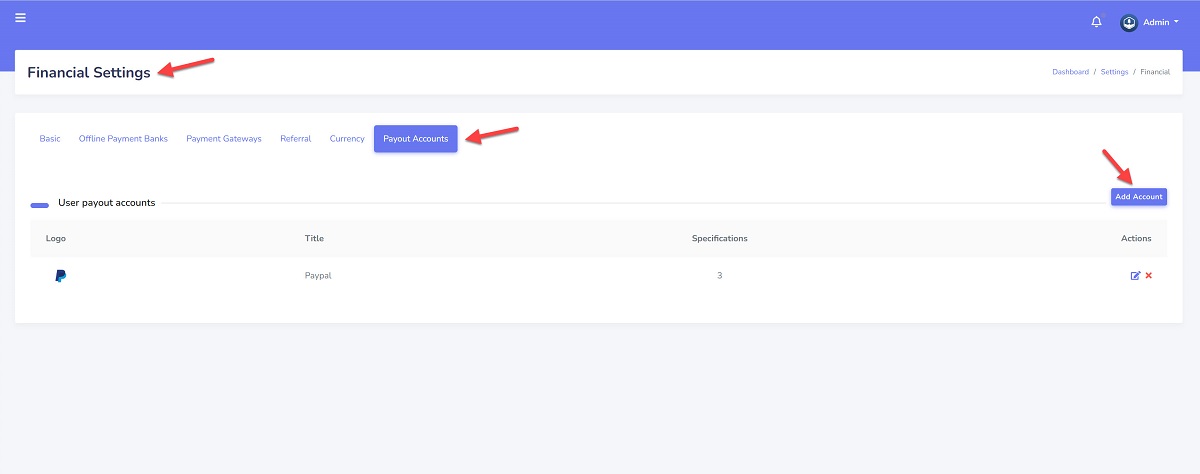Please go to the “Admin Panel/ Settings/ Financial/ Payout Accounts” menu. And click on the “Add Account” button.